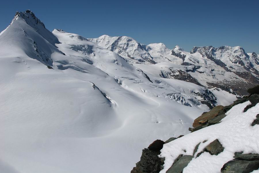 12-na vrcholu Alphubelu, vzadu skupina Monte Rosa (uprostred Dufourspitze 4634m, vpravo od nej Liskamm 4479m).jpg